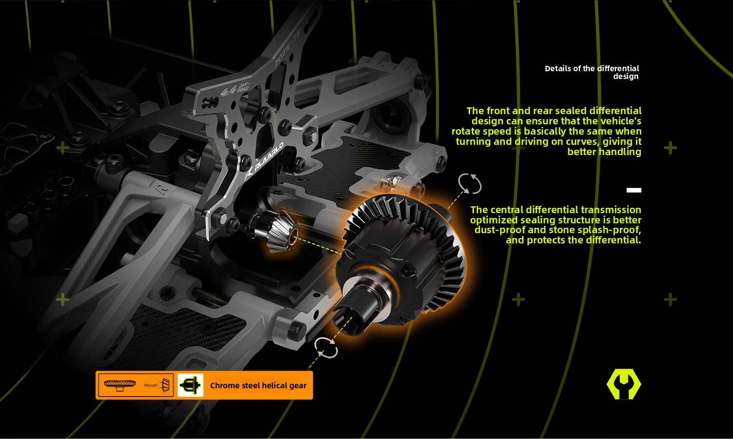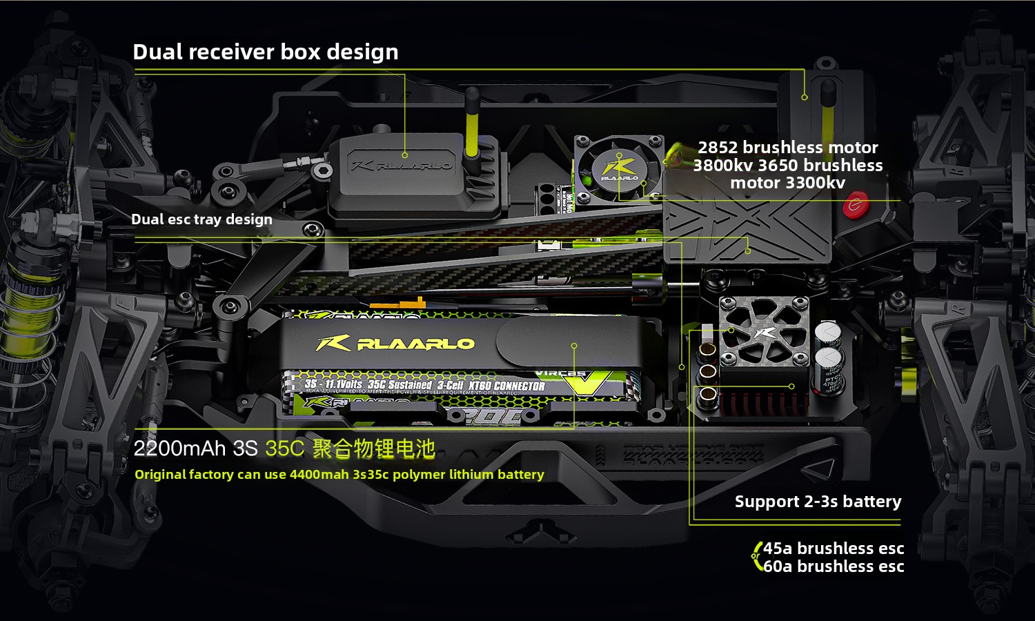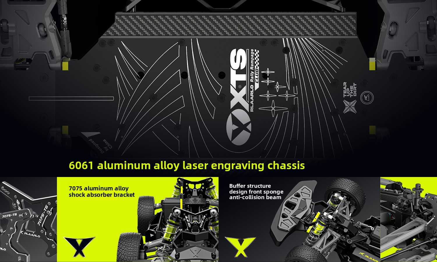 Available in high-strength 6061 aluminum alloy or lightweight carbon fiber chassis options. Equipped with 4mm thick 7075 aluminum shock towers and metal drivetrain components, built to withstand high-intensity off-road impacts. -