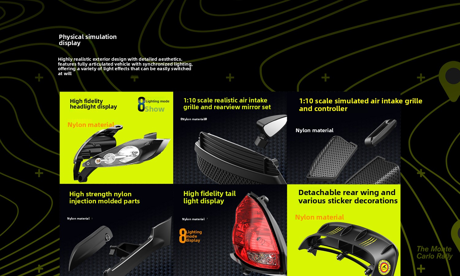 Features a full functional lighting system, including separate light buckets, spoiler, hood grille, roof intake, anti-splash foam, and more, perfectly capturing the authentic look of a real rally car.