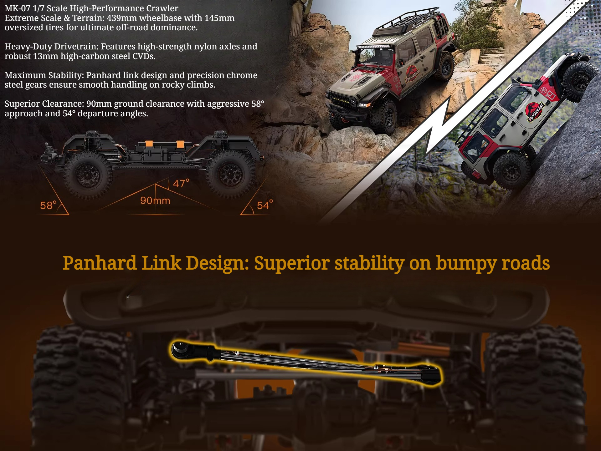 1/7 Scale Large RC Crawler MK07: 4WD Off-Road Adventure Vehicle with Remote Locking Differentials & Transmission Disconnect Ultra-Scale Off-Road Adventure Vehicle | Brushed & Brushless Editions 🚀 Key Highlights Massive 1/7...
