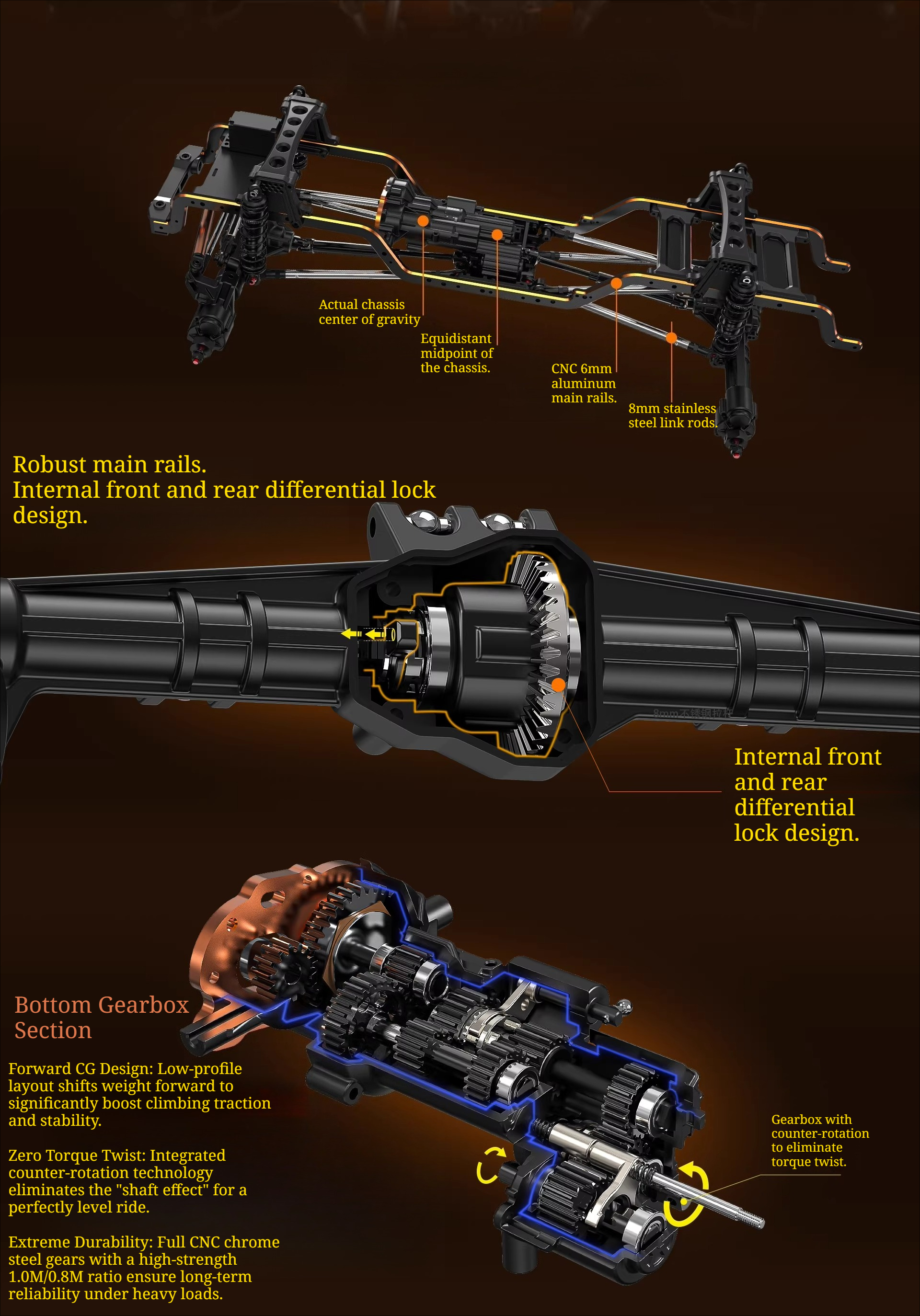 Advanced Drivetrain: Features remote-locking Differential Locks and a Transmission Disconnect system, allowing you to switch between high-speed bashing and technical rock crawling on the fly.
