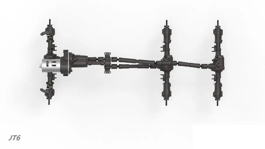 Flexible Differential Lock Control: Equipped with a 6-wheel, three-axle controllable differential lock system. The front axle and the dual rear axles are controlled by two independent servos, allowing drivers to flexibly engage or disengage differentials based on terrain.