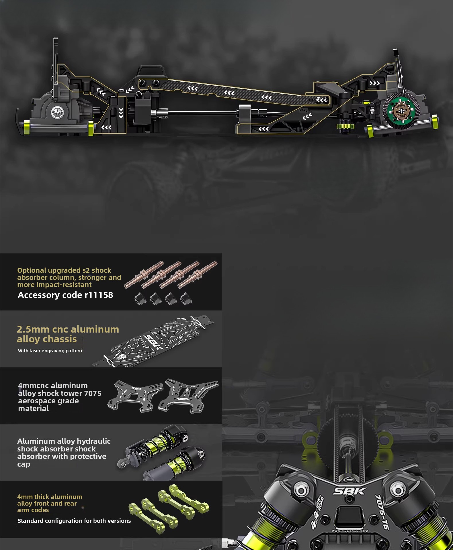 Race-Ready Handling Geometry: Equipped with front and rear anti-roll bars and 4mm thick 7075 CNC-machined aluminum shock towers for exceptional cornering stability.