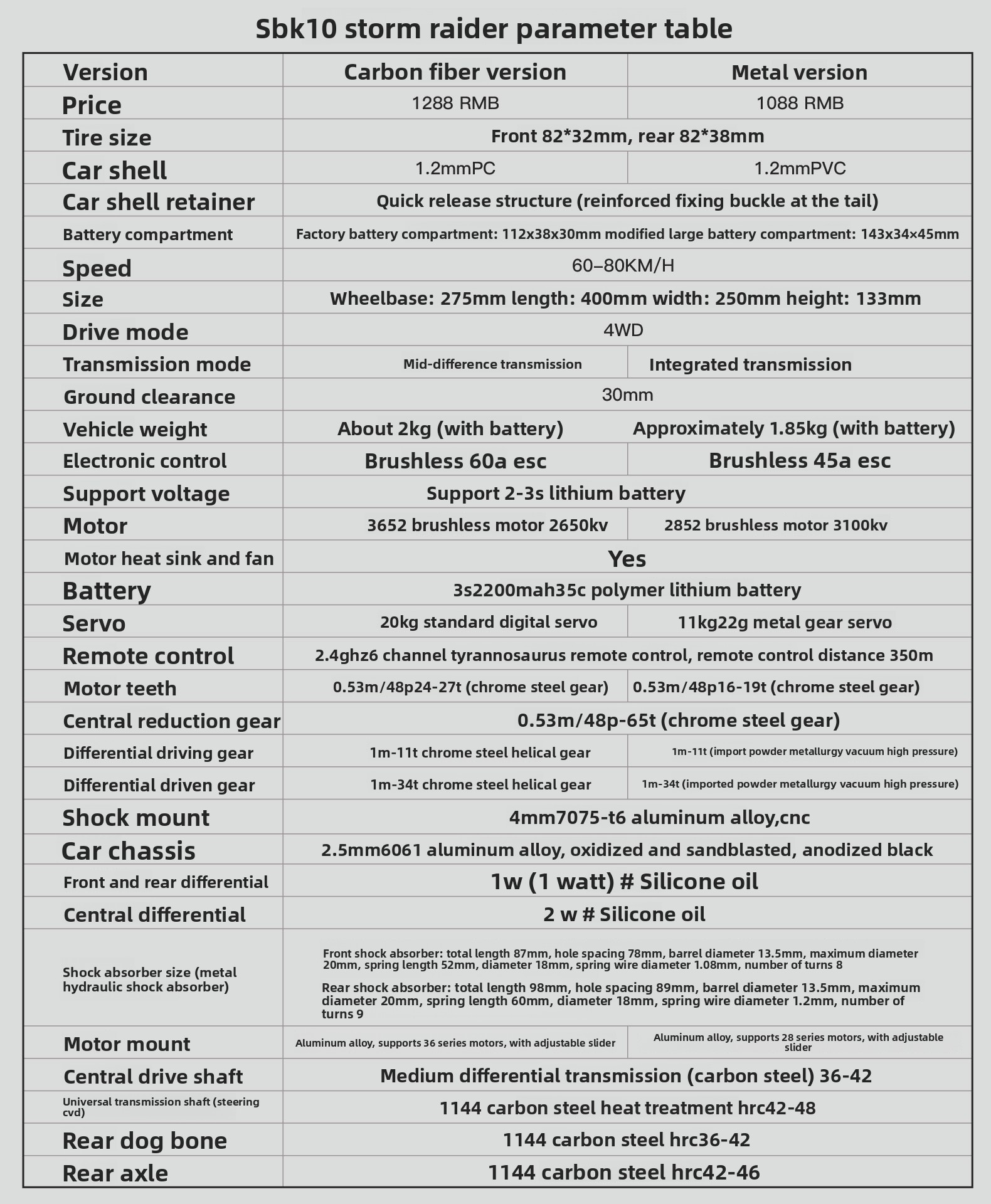 | Motor | 2852-3100KV Brushless | 3650-2650KV High-Torque Brushless |