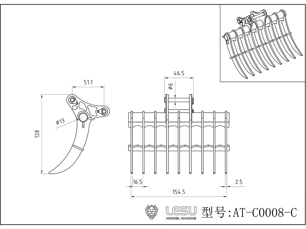 Introduction: Enhance the versatility and realism of your 1/14 scale hydraulic excavator with the LESU AT-C0008 Metal Rake Attachment. Specifically designed for the ET35 short-tail excavator and custom DIY modifications, this high-precision rake bucket allows you to simulate complex land clearing and material sorting tasks with ease.